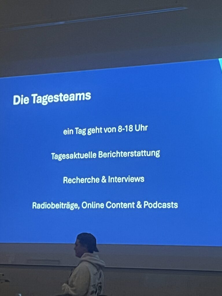 When the presentation moved on to the station’s structure (news, music programming, and cultural formats), the speakers clarified when each section met and what kind of availability was expected to join them. I noted down times and titles without fully understanding what distinguished one section from another. I knew I was interested. I just didn’t know where I would fit. Not speaking German, I started clinging to fragments. When I saw the word “Tag” appear on the slides, I remembered it meant “day,” which led to a series of small, personal deductions. I had already discovered döner kebabs by then, so for a moment I convinced myself that Donnerstag might be the “day of döners,” an unexpected, if slightly hopeful, gastronomic insight. I was pulled back into the room by laughter, another joke I only understood a few seconds too late.