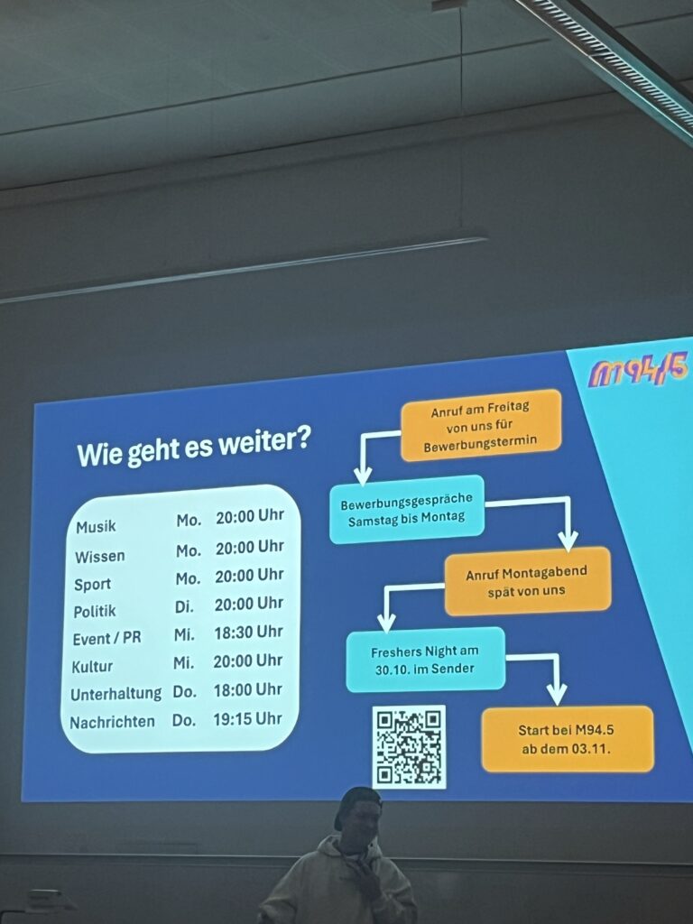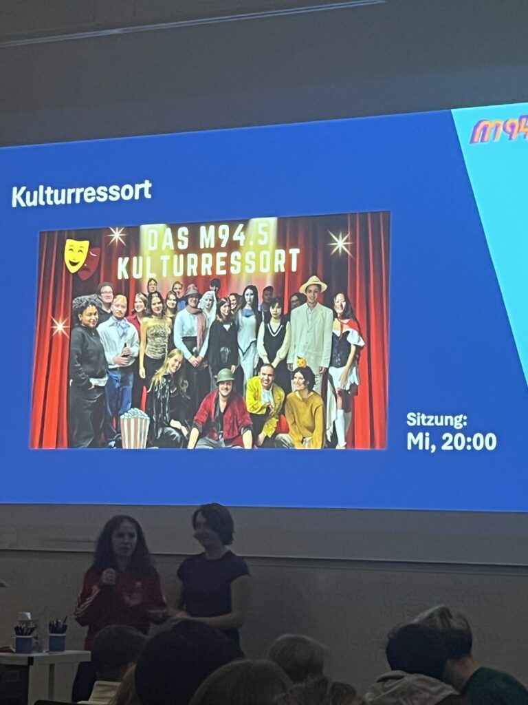 The presentation was in German. I had never really considered that it could be otherwise, I had assumed, almost instinctively, that an information session aimed at all students would be held in English. Even the slides were in German. They were meant to explain how M94.5 works: the different editorial sections, the training process, and the path from volunteer to host. I recognized a few words (Redaktion, Sendung) but not enough to follow the logic. Ironically, this information session was designed to lower the barrier to entry for new contributors. Instead, it quietly revealed another one.