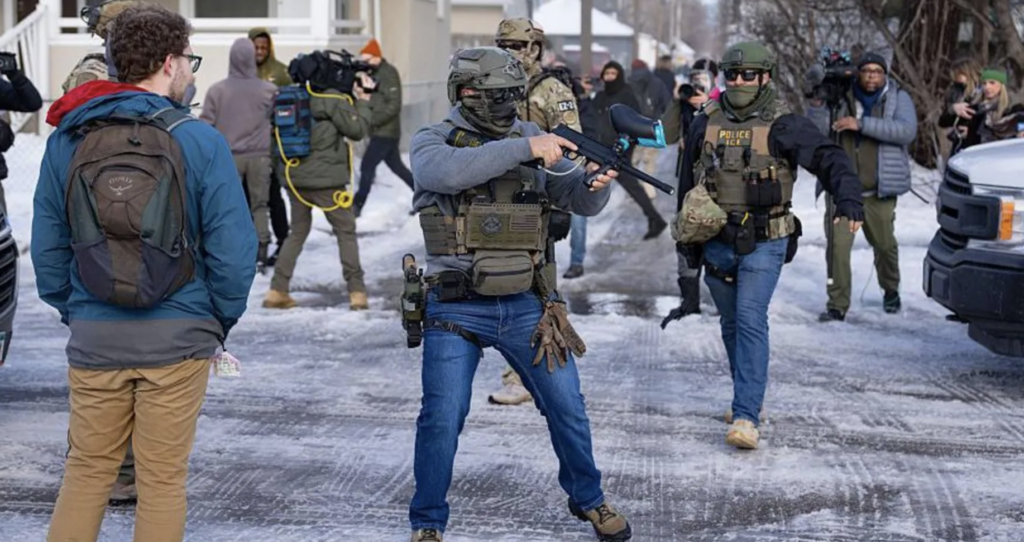 ICE and other federal officers stand at a Minneapolis intersection where protesters had gathered after the death of Renee Nicole Good. Source: BBC.